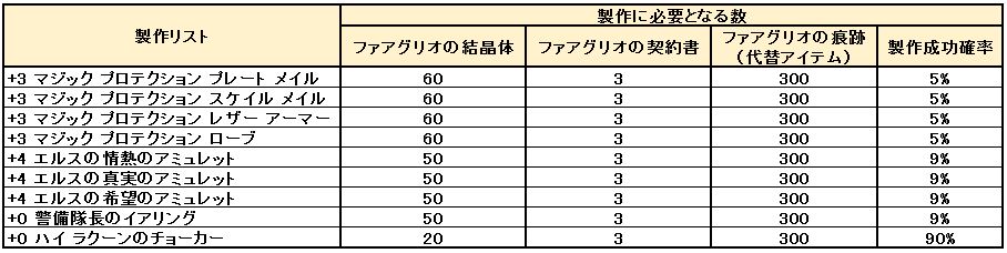 ※「ファアグリオの痕跡」は「ファアグリオの契約書」の代替として使用できるアイテムであり、どちらかのみ製作材料として指定できます。